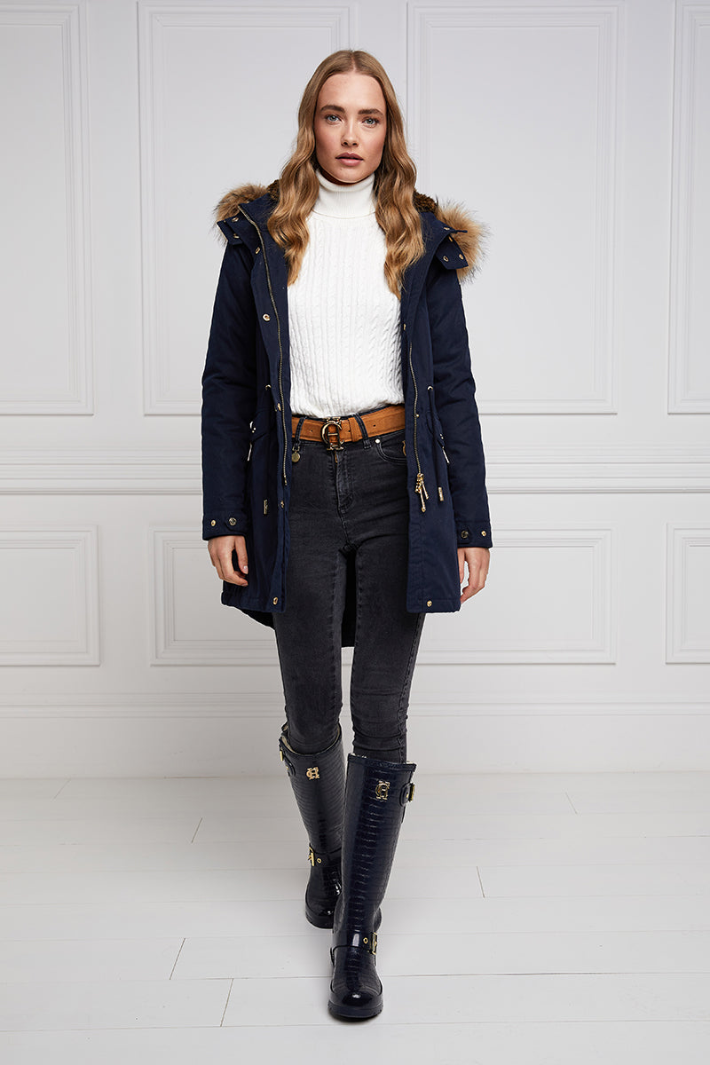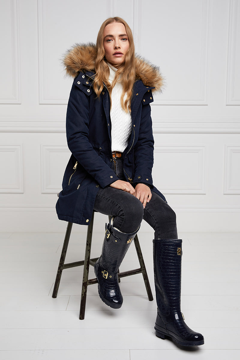 Designed for ultimate warmth and comfort, this eye-catching wellington boot features a full thermal Sherpa lining that keeps your feet and lower legs insulated and cozy in all conditions. Crafted from 100% waterproof, superior vulcanised rubber and detailed with iconic HC gold hardware, it blends practicality with standout style. The adjustable side gusset ensures a comfortable fit across a range of calf sizes, making it perfect for various wearers. Packaged in a signature green and gold boot box, this boot is a luxurious, vegan-friendly choice for wet weather.